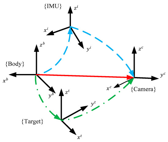 As our objective is to measure the relative angles between the body coordinate system and one stationary reference frame, such as the camera coordinate system, it can be expressed by rotation matrix . The in the parentheses indicates that the matrix is time-varying. The coordinate system normalization is to transform the inertial and visual measurements into the . The mathematical model of rotation transformations from the c system to the b system by visual and inertial quantity can be expressed as follows: