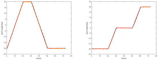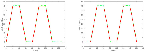 Another two repeated experiments with longer running times were conducted to confirm the performance of the proposed RBF-CKF method. The motion trajectory of the moving object is shown in Figure 11, which has a round-trip motion. The pitch and yaw axes range from 0° to +40° in round-trip form. Two groups of experiments were carried out and the attitude angle errors of pitch and yaw angles are shown in Figure 12. The optimal estimation of RBF-CKF can be displayed in pitch and yaw angle errors with long data. It is clear that the performance of RBF-CKF is superior to the other four methods with long data. During the period when the errors of the other four methods are relatively large, such as 40–60 s and 120–140 s for the pitch axis as well as 20–40 s and 100–120 s for the yaw axis, the RBF-CKF remains stable. Actually, RBF-CKF possesses the good convergence during the intersampling of vision data.