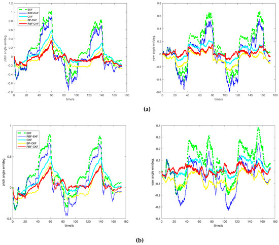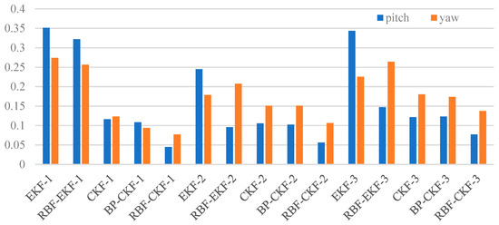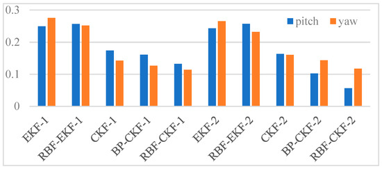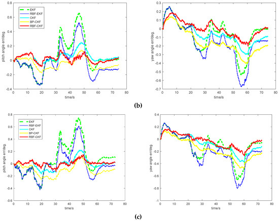 To provide convincing results, the performance of five different methods are conducted and the attitude angle errors of the pitch angle and yaw angle are shown in Figure 9, where the abscissa is time in seconds and the ordinate represents the pitch and yaw angle errors. It can be directly seen that considering the overall performance of the five methods in the viewpoint of stability and precision, the proposed RBF-CKF method outperforms the EKF, RBF-EKF, CKF and back propagation neural network (BPNN) BP-CKF methods. Besides, during the period when the errors of other method is quite large, such as the 40–60 s for the pitch axis as well as 20–40 s and 40–60 s for the yaw axis, the RBF-CKF can stay steady, which indicates its stability. More importantly, it indicates the RBF-CKF algorithm can maintain good convergence during the intersampling of slow visual data.