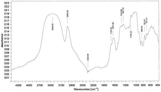 FTIR analysis of cinnamon (Figure 1) showed the presence of groups –OH (3346.25 cm−1) and –C-H (2928.26 cm−1, 1416.64 cm−1, 1367.87 cm−1, 848.63 cm−1) derived from –CH2OH or from the ring in cellulose; the aromatic ring (1631.68 cm−1, 763.47 cm−1, and 707.31 cm−1) derived from cellulose, flavonoids, and phenol acids; and 1152.23 cm−1 represents the aromatic ether from flavonoids. –OH groups can be largely derived from cellulose.