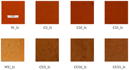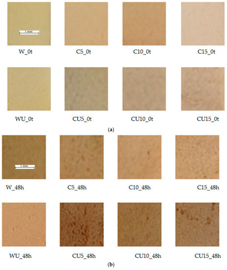 Foam color test results are included in Table 4. The test results showed a practically small increase in the brightness of the foams at once with increasing cinnamon extract content in unheated and non-conditioned foams (brightness L was from 82.825, in foam W_0t to 66.735, in C15_0t foam). At the same time, these foams contained more red (a) and yellow (b). The L range was from 71.400 (W_48h) to 62.625 (CU5_48h) for foams aged in the dryer within 48 hours. At the same time, the content of red and blue color increased in them. Foams conditioned in the air conditioner (series 1t) resulted in the reduction of the L factor (50.78–57.285) and in the increase in parameter a in the range from 13.68 to 21.635 in relation to a parameter of the 0t series (from −3.625 to 3.420). The ∆E parameter of 48 h thermostated foams was from 68.138 to 77.132 and conditioned foams (1t series) was from 59.998 to 62.444 in relation to the value of ∆E of 0t series (from 72.772 to 87.461).