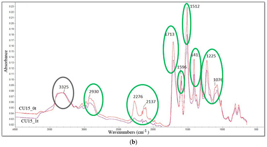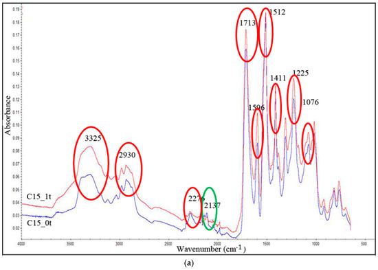 The FTIR spectra (Figure 4a) of the foams with a maximum cinnamon extract content (15 wt%) and with flame retardant content, before degradation (C15_0t) and after degradation (C15_1t) where compared. The FTIR spectra of the foam with flame retardant (C15_0t series) subjected to degradation (C15_1t) showed that after degradation the intensity of the bands associated with the bonds (red lines) increases: N–H (3325 cm−1), CH (2930 cm−1), –N=C=O (2276 cm−1), –C=O (1713 cm−1), –NH (1596 cm−1), –N–H (1512 cm−1), isocyanurate ring (1411 cm−1), –C=N in the trimer (1225 cm−1), –C–OH (1076 cm−1). The bond associated with the –N=C=N– (2137 cm−1, green line) decreased.