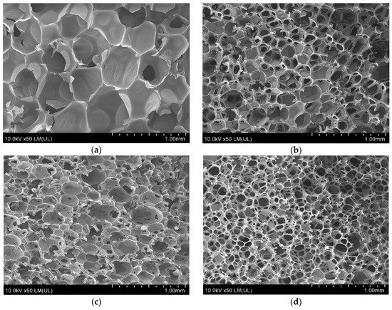 The foam structure was determined by Hitachi TM 3000 SEM with EDS attachment (Hitachi High-Technologies Co., Tokyo, Japan). The samples were dusted with a gold layer that was about 6 nm thick. The studies were performed at the accelerating voltage of 10 kV, with the working distance 10 mm and magnification at 50×. The statistical analysis of cell sizes was carried out on the basis of obtained micrographs by using ImageJ software (LOCI, Madison, WI, USA).