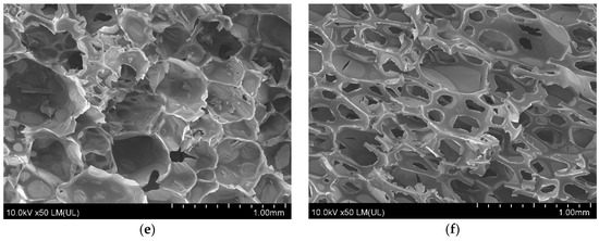 The cell walls were destroyed during conditioning (Figure 5b,d,f) (under given conditions) and additional holes were formed. In the SEM study, these additional holes were interpreted and measured by the program as cells (and not as holes created as a result of wall destruction). On a given surface (in this case 1 mm2) additional holes were interpreted as a smaller cells (not as a real cells). In fact, the results in Table 12 relate to measurements of holes created after destruction and not measurements of real cells. Measurements proved that foams conditioning (series 1t) were destroyed (the thinnest fragments of the walls were broken); see Figure 5b,d,f).
