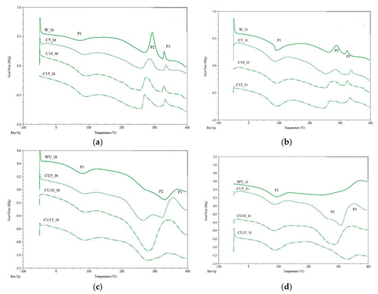 Degradation of the reference foam WU_0t (without cinnamon extract, without flame retardant) resulted in the disappearance of the endothermic peak of the WU_1t foam (Figure 6c,d). In the CU_1t foam series (Figure 5d), pronounced endothermic peaks were observed at temperatures above 300 °C for CU5_1t, CU10_1t, CU15_1t foams. Any endothermic peak was not observed for WU_1t, at approximately 300 °C. The disappearance of the first exothermic P2 peak was also observed in the temperature range from 265 °C to 300 °C (occurring in the C_0t and C_1t series containing the flame retardants; Figure 6a,b) relative to the series without flame retardant (CU_0t and CU_1t, Figure 6c,d). The second exothermic peak P3, was preserved.