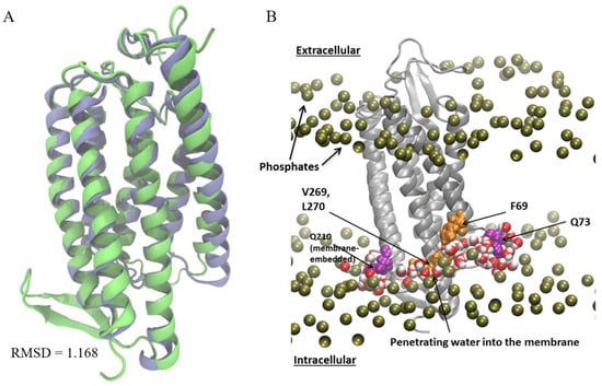 To quantify residual hydrophobic mismatch for ChR2 in the POPC membranes, we obtained an extended simulation trajectory from MD simulations of the ChR2 homology model based on the C1C2 structure, embedded in a POPC lipid bilayer. The ChR2 homology model aligns closely with the recently solved X-ray structure of ChR2 (Figure 2A) with a RMSD of 1.17 Å (Figure 2A) [39]. The most notable structural differences occur in the N-terminal domain and the loop between TM1 and TM2. The CTMD approach was then used as previously described [22,27] to calculate the consequences of protein-membrane interaction, including membrane deformation and the free energy cost of the RHM. The analysis revealed significant residual hydrophobic mismatch in WT ChR2 (Table 1). Although membrane deformation had alleviated some unfavorable interactions, residues located at the cytoplasmic interface of TMs 2, 6 and 7 remained exposed to either polar or hydrophobic inappropriate environments due to the local adjacency to residues with diverse properties that prevented further adaptation of the membrane (see References [22,27]) Consequently, Q73 on TM1 and Q210 on TM6 were found to face the hydrophobic interface of the membrane. This caused membrane thinning in the adjacent regions of both residues, leading to water penetration into the membrane and exposure of V269 to a polar environment (Figure 2B). Substantial RHM was also observed at N187 and V269. Notably, mutations at these positions have previously been shown to affect ChR2 function [32,49].