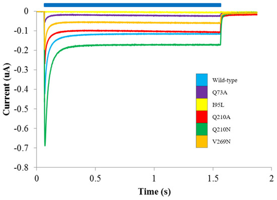 Representative photocurrent traces for RHM ChR2 mutants. Photocurrents were recorded in Na+ solution at pH 7.5 at Vm = −100 mV. Blue bar indicates illumination with blue light. WT—blue; Q73A—purple; I95L—yellow; Q210A—red; Q210N—green; V269N—orange.