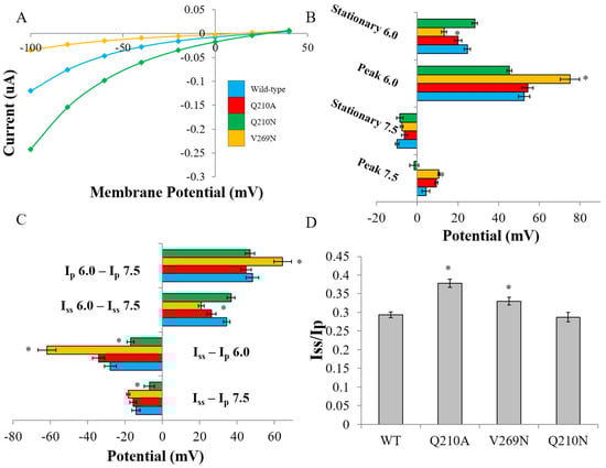Biophysical characterization of RHM-affecting mutants. (A) Representative steady-state current-voltage relationship of select mutants in Na+ 6.0 solution. (B) Absolute reversal potentials determined at Ip and Iss in Na+ solutions at either pH 6.0 or 7.5. (C) Differences in Erev determined as noted. (D) Steady-state to peak current ratios, which are a measure of ChR2 inactivation. Values are reported as the average ± SEM (n = 7–15). Statistically significant values are denoted with * (p < 0.05). WT—blue; Q210A—red; Q210N—green; V269N—orange.