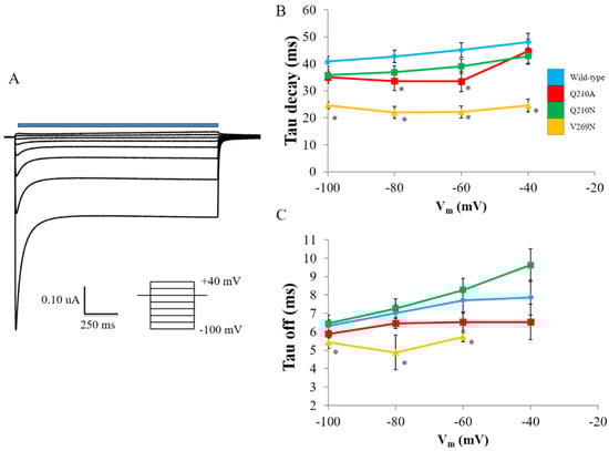 Apparent rate constants for decay and off kinetics were calculated. Decay kinetics were calculated by fitting ChR2 photocurrent traces from Ip to Iss with a monoexponential or biexponential equation, respectively (Figure 5A). V269N had the largest effect on decay kinetics, resulting in accelerated inactivation. Q210A and the null mutant Q210N had no significant effect on decay kinetics (Figure 5B). A similar trend was observed for off kinetics, with V269N having accelerated rates and both Q210 variants not significantly altering kinetics (Figure 5C).