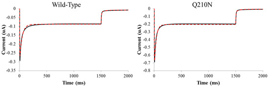 With the four-state model, we explored the population of states at specific time points (Table 4). The time at which each ChR2 construct reached peak current was quantified. Both Q210 variants were comparable to WT (8.0 ms), while V269N was accelerated (5.3 ms). Next, the population of O1 and O2 was evaluated at the time point that corresponded to Ip and also directly before the light was turned off at 1490 ms. Analysis of the two time points revealed similar state populations for all mutants and the WT. The largest variation occurred for O1 at Ip where the RHM mutants Q210A and V269N had higher occupancy while the null Q210N mutant was lower.
