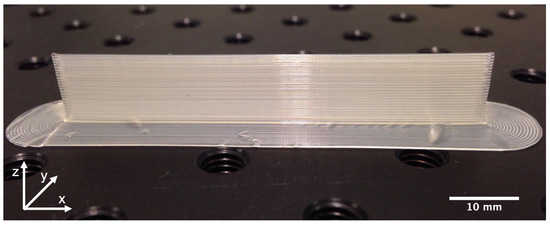 A custom G-code was written and uploaded in the Ultimaker 2 FFF printer equipped with a 0.4 mm diameter nozzle to print the required samples. Figure 1 shows the sample geometry, which consisted of a 60 mm wide wall with a thickness of one layer in the y-direction. On top of the brim, defined as Layer 1, 50 layers were added with a layer height of 0.2 mm. Kapton tape was applied on the build plate to ensure sufficient adhesion of the printed sample. During printing, the Ultimaker 2, which is open at the front and top, was covered with the Ultimaker 2 PPMA cover (Ultimaker, Geldermalsen, The Netherlands) to limit the influence of distortions in air flow of the surroundings. However, the temperature of the build environment was not regulated, since the Ultimaker 2 does not allow for environmental control.