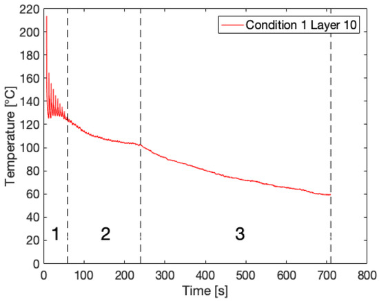 IR thermography directly provides the thermal history of a deposited layer monitored over time. Figure 2 portrays an example of a recorded temperature profile for Layer 10 of Condition 1 with three distinguishable zones. Initially, cyclic heating and cooling can be observed, which is due to deposition of new layers onto the monitored layer, resulting in sharp peaks (Zone 1). Here, the layer experiences high heating and cooling rates up to 200 °C/s within a very narrow time window. Earlier studies reported cooling rates around 400 °C/s and even 700 °C/s for fused deposition of PP and PPS, respectively [17,56]. It should be noted that the recorded peak temperatures are several tens of degrees lower than the set liquefier temperature of 260 °C, as was previously reported in the literature [27,28,33,36]. Other authors have attributed this discrepancy to the limited residence time of the polymer filament in the liquefier, especially at higher print speeds, resulting in a difference of 20 °C between the set liquefier temperature and extrudate temperature at a print speed of 4.5 mm/s, which is still considerably lower than the print speed set at 11 mm/s in this case [57]. Although convection with ambient air is the most dominant cooling mechanism, the conduction from the build plate becomes visible through the increasing lower limit of the peaks at longer time scales. After deposition of multiple layers, the influence of newly deposited layers loses intensity and the layer temperature cools down to the build plate temperature of 110 °C (Zone 2). Once printing is finished, i.e., the last layer is deposited, the layer temperature cools down even further, yet more gradually, since the build plate itself is cooling down (Zone 3).