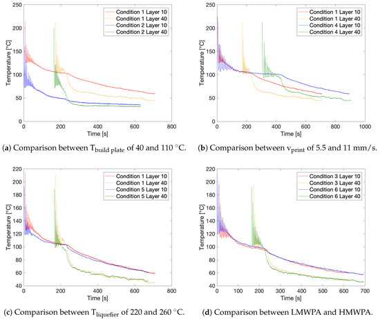 An overview of the resulting temperature profiles for the different applied print settings is displayed in Figure 3. All thermal profiles exhibit the three distinct zones. When comparing the temperature profile of the 10th and 40th layers for all conditions, the peak temperatures are similar, whereas the lower limits of the peaks have shifted downwards. This phenomenon can be attributed either to the reduced conduction originating from the build plate at layers printed higher above the build plate or to the decrease in ambient air temperature further away from the build plate, which will enhance convective air cooling, or to a combination of both. The second zone is obviously shorter for Layer 40. The cooling rate in the third zone, when printing has stopped, is also lower for Layer 10 than for Layer 40, since the build plate cools down slowly due to its large thermal inertia. Setting the build plate temperature, Tbuild plate, to 40 °C instead of 110 °C has a significant impact on the temperature experienced by a monitored layer as demonstrated in Figure 3a, comparing Conditions 1 and 2. Although, initially, the first peak temperature lies in the same range, temperature decreases quickly. This is due to the limited conductive heat transfer from the build plate, and the lower ambient temperature. Hence, the overall temperature profiles for Condition 2 are shifted downwards by approximately 50 °C. Figure 3b compares Conditions 1 and 4 and shows the effect of halving the print speed, vprint, from 11 mm/s to 5.5 mm/s. As a consequence of reducing the print speed by 50%, the required printing time is doubled. Since the internal temperature of the IR camera cannot exceed 45 °C, it had to be taken off the build plate directly after the print had finished. Therefore, only the first and second zone could be measured for Condition 4. However, the cooling in the third zone is assumed to be similar to Condition 1, as for both conditions the build plate temperature is identical. The temperature peaks at half of the print speed are spread out horizontally, giving more time for a deposited layer to cool down in between deposition of subsequent layers, as is visible from the decrease in the lower peak limits. A slower print speed will increase the residence time of the polymer filament in the heated liquefier as can be observed from the slightly higher peak temperatures recorded for Condition 4. The second zone is also prolonged. A difference in liquefier temperature, Tliquefier, of 40 °C has a noticeable effect on the achieved peak temperatures, which are considerably lower at reduced liquefier temperatures, as depicted in Figure 3c. However, due to identical build plate temperatures, the thermal profiles will evolve to similar temperatures over the course of the second and third zone. Finally, the LMWPA and HMPWA printed with identical settings exhibit similar peak temperatures and their recorded temperature profiles almost coincide in the second and third zone. Despite these similarities, the lower peak limits of the HMWPA are remarkably lower compared to the LMWPA, which seems to better retain the heat provided by previously deposited layers, as can be seen in Figure 3d.
