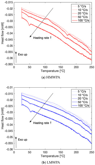 The heat flow signals [mW] from FSC at increasing heating rates for HMWPA and LMWPA are displayed in Figure 4a,b, respectively. Especially for HMWPA, cold crystallization peaks become clearly visible at heating rates from 5 to 20 °C/s in the range of 50–150 °C. The subsequent melting peaks above 150 °C indicate melting of the formed crystalline structures. Even for a heating rate of 50 °C/s, a very broad cold crystallization peak and successive melting peak could be observed. For LMWPA, these cold crystallization peaks are less apparent. However, a heating rate of 100 °C/s shows no cold crystallization peaks for both materials and is thus adopted as the critical heating rate. For all measurements, a cooling rate of 250 °C/s was applied before heating at the distinct rates. Since no melting peaks emanate when heating at the critical heating rate of 100 °C/s, it is assumed the materials are completely quenched at a cooling rate of 250 °C/s, thus fully suppressing crystallization, which supports the selection of this rate as the critical cooling rate. Note that the glass transition temperatures of both materials appear at higher cooling rates as a drop in the heat flow signal between 40 and 50 °C.
