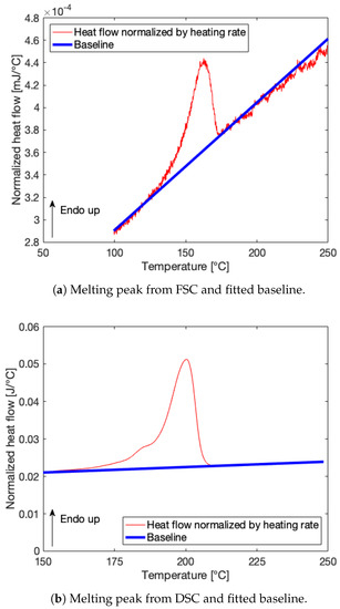 The melting peaks in the heat flow signals normalized to the heating rates of 100 °C/s and 10 °C/min from FSC [mJ/°C] and DSC [J/°C] can be fitted with a baseline. Figure 5 gives an example of the resulting melting peaks for LMWPA. By integration of the area enclosed by the melting peak and baseline over temperature, a value for the melting enthalpy is obtained. The corresponding FSC sample mass can then be calculated through Equation (1) and amounts to 98.86 and 33.88 ng for the HMWPA and LMWPA FSC samples, respectively. The results for both materials are summarized in Table 3.