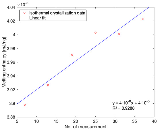 For consecutively executed measurements, a correction factor for drift attributed to sample changes was established starting from melting enthalpies normalized to sample mass produced by isothermal crystallization measurements. Melting enthalpies were again obtained by integrating the peak area between the heat flow signal normalized to the heating rate and the baseline fitted onto the heat flow signal. By plotting the melting enthalpies acquired from isothermal crystallization at 125 °C versus the respective sequence number of the measurement in the array of successively performed measurements, a linear trend can be distinguished. Figure 6 illustrates this trend with an example for isothermal crystallization data obtained during FSC measurements corresponding to Conditions 2, 3 and 5, which form one measurement sequence. The opposite of the slope of the linear fit can thus be utilized to correct for the, in this case, upwards data drift inherent to less stable samples such as PA. The product of the correction factor and the respective sequence number of the measurement should then be added to the melting enthalpy value normalized to the sample mass. Three distinct measurement sequences were performed to assess the development of crystallinity for the different printing conditions using FSC. The corresponding correction factors are listed in Table 4.