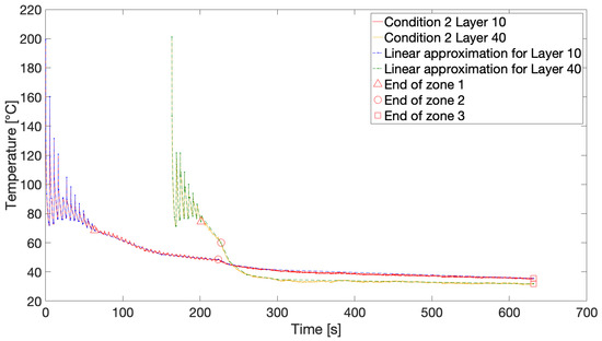 The linear approximation of the temperature profiles for Condition 2 with markings for the end of each zone.