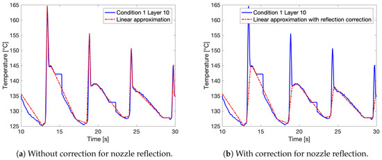 Figure 8a shows a more detailed view of the linear approximation imposed onto the thermal profile for Layer 10 of Condition 1. Here, the data loss accompanying the automatic calibration of the IR camera is clearly visible as segments with constant temperature. The linear approximation cuts off these segments, since the period of data loss is smaller than the actual approximated segment of the temperature curve. The peaks of the temperature profile, coinciding with successive deposition of new, hot layers, reveal a dual peak. This dual peak consists of a superposition of a sharp initial peak, attributed to the reflection by the nozzle of the print head, and a second peak with more gradual cooling corresponding to the actual deposition of a new layer. Since no IR intensity values can be accessed through the IR camera software, no correction for the nozzle reflection can be applied on the recorded IR profile as was previously reported in literature [35]. For Conditions 1 and 6, two approximations of their thermal profiles were analyzed to examine the effect of using the corrected linear approximation: one for which the full profile was approximated and one for which correction for the nozzle reflection was applied, shortcutting the first sharp peak, as illustrated in Figure 8b.