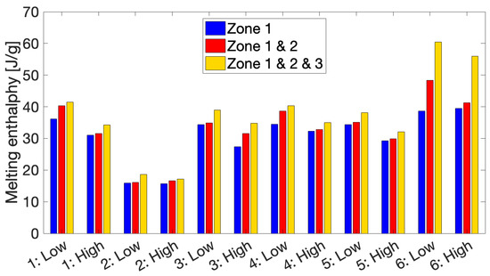 An overview of the resulting melting enthalpies after each zone in the thermal profile for the different print conditions.
