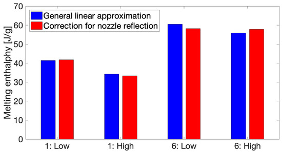 The effect of applying the linear approximation corrected for nozzle reflection on the melting enthalpies after simulation of the full thermal profiles.
