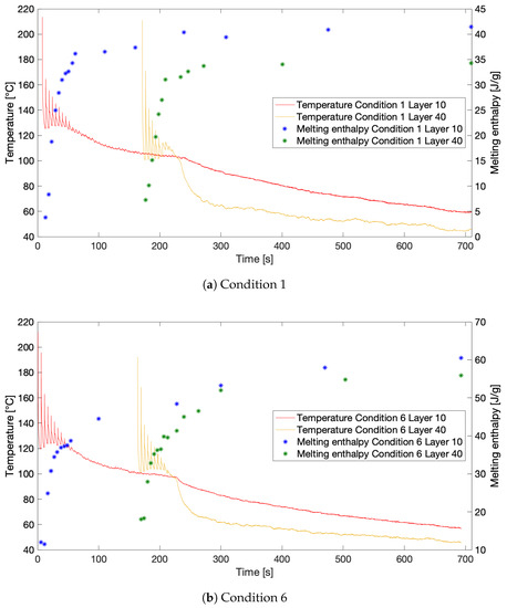 For Conditions 1 and 6 in Table 2, the temperature profile for both the 10th and 40th layers were interrupted by a heating cycle after every temperature peak, resulting from the deposition of a new layer, as well as after every linear segment during cooling down of the printed part to monitor the gradual build-up of crystallinity over time in more detail. The resulting heat flow signals [J/s] were normalized by dividing by the applied heating rate [°C/s], since the integrated peak area differs according to the applied rate. A result was obtained in units of heat capacity [J/°C]. The melting peak of each signal was integrated as described in Section 2.3.3. The resulting value of the integrated peak area should then be divided by the respective sample mass of the utilized chip to compare between results obtained for HMWPA and LMWPA. Afterwards, the correction for the inherent drift due to sample changes should be applied. The obtained melting enthalpies were an explicit indication of the degree of crystallinity developed in the printed part. Any difference or trend in melting enthalpy values signified an identical trend in crystallinity. The PA 6 and PA 66 segments of the copolymers were expected to crystallize in their own crystal structure. The values of the melting enthalpy for 100% crystalline PA 6 and PA 66 as reported in the literature amount to 230 and 255.41 J/g, respectively [53]. Thus, if the exact sample composition of each of the copolymers was known, which would be considered identical for both copolymers, a value for the reference melting enthalpy associated with 100% crystallinity could be calculated based on the relative distribution of PA 6 and PA 66 segments. This would allow a direct conversion of the melting enthalpies to absolute crystallinity. Unfortunately, the exact sample composition was unknown. Hence, only melting enthalpies are reported. Earlier research on random PA 6/66 and PA 11/12 copolymers shows a significant influence of comonomer ratio on the observed melting point, which corroborates the assumption of an equal sample composition of the copolymers utilized in this study, since they presented almost identical melting temperatures [54,55].