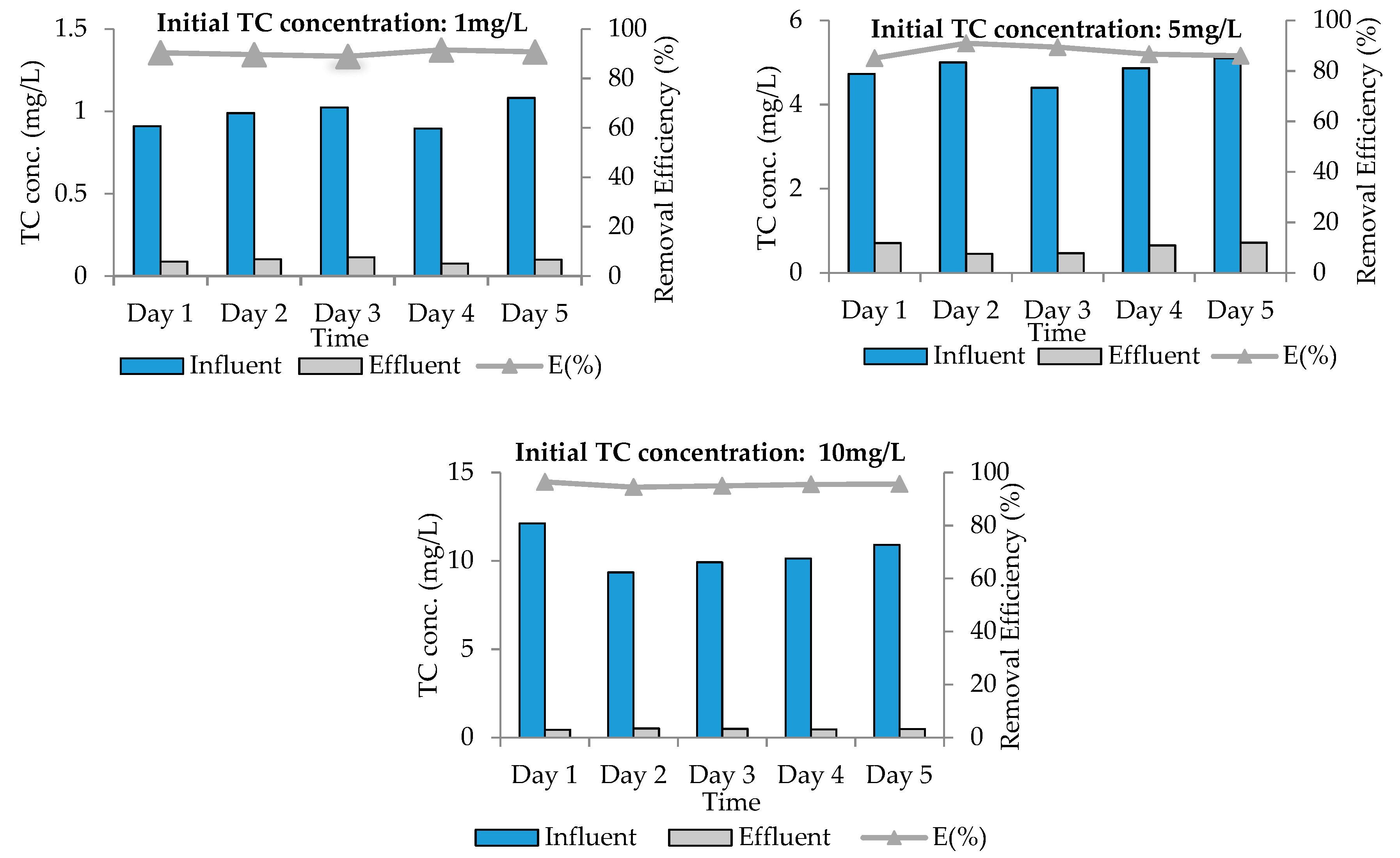 3.3. The Removal of Tetracycline in the CW Treatment System