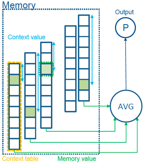 - bucket lookup–the context value indexes a bucket with an array of tagged values. The selection of the memory value is done by searching the bucket for a matching tag. In this way, we can implement complex replacement rules for the values inside the bucket. We provide a “least bias” eviction rule when no tag is matched in the bucket. This means kicking the location with the value closest to zero. In this way, we keep the values that can bring benefits to the compression. Computing the output and the update rules are the same as in tagged lookup. If the bucket size is kept small (4 to 8 entries), the linear search is done in the same cache line, making the speed comparable to the tagged lookup.