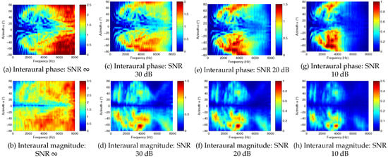 The BRIRs used in the testing are generated with CIPIC HRTF subject ‘003’ and the Roomsim MATLAB program [34] based on the image method in four empty ‘shoebox’ rooms. A rectangular room with room sizes 5 m × 5 m × 3 m is created in the simulation. The subject head is fixed at (2.5, 2.5, 1.2) m and the sound source is positioned around the subject with the same position scheme as used in the CIPIC database, so there are 1250 source positions (25 azimuths × 50 elevations) in total during the tests. The distance between the sound source and the center of the head is fixed as 1.5 m so that the acoustical environment can be considered a far-field environment. The strengths of reflections are manipulated by the absorption coefficients on the walls. In the additive noise test, four sets of data are generated and tested with different SNRs. The absorption coefficients are set as , so no reflections present and the interference is entirely caused by noise. As for the reverberation test, the absorption coefficients are tuned from 0.8 to 0.2, and the corresponding varies from 100 to 500 ms approximately.