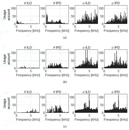 Feature Usage Accounts for training condition (a) SNR = ∞; (b) SNR = 20 dB and (c) SNR = 10 dB. The first two columns shows the feature usage for azimuth model and the last two columns shows the average feature usage for elevation model.