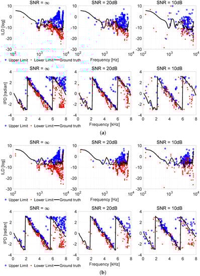 Figure 5 demonstrates the feature characteristics captured by the splitting values from the direction and . In each sub-plot, each column shows the additive noise SNR for a training dataset and each row shows the type of features. Each blue circle represents a ‘left’ condition in a node from a single tree, which is also defined as the upper limit of in (14). Similarly, each red cross represents a ‘right’ condition in a node or the lower limit value of . The ground truth features are plotted in black solid curves, which are obtained from pure HRTF data. Each marker, either a circle or cross, is considered a classifier to evaluate whether an extracted feature vector fits the conditions for a specific direction. By observing the distribution of markers, it again justifies that the features in frequency above 2 kHz are more valuable. The ground curves almost overlap with the dividing line between circles and crosses, which indicates that the major features have been captured by those upper and lower limits. In each row, the influence of the training condition can be compared. In the case where SNR = ∞, though the curve fits best, the markers are distributed closer, which means that the independence between trees is comparably low, which may lead to over-fitting on some features. Meanwhile, in SNR = 10 dB, the markers are more dispersed and the dividing lines are blurred because of the high noise level, which will cause loss of some details of the feature characteristics, and lead to decreasing localization accuracy.