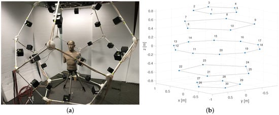 In the audio playback system, 30 loudspeakers are placed on a regular dodecahedron. The loudspeakers are fixed on the middle of the edges and face to the center of the dodecahedron, as shown in Figure 11a. Figure 11b demonstrates the ground truth loudspeaker array placement positions and their corresponding labels in the Cartesian coordinate system. All loudspeakers are driven by the Dante audio network system, as shown in Figure 12a, which is controlled by a computer. As for the recording system, the signals are captured by two Type 40AG polarized pressure microphones planted in the ear canals of the dummy head. The captured signals are then converted via the U-PHORIA UMC202HD audio interface and transferred to another computer via a USB connection.