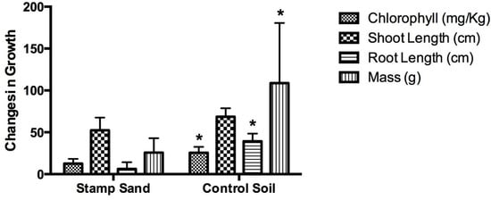 Effect of stamp sand on the growth of vetiver grass compared to control soil. Error bars represent standard deviation with n = 6. Statistical significance was determined using Welch’s t-test and with α = 0.05. (*) denotes p-value < 0.05.