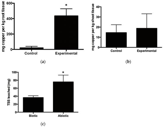 Copper accumulation in vetiver grown (biotic columns) in control soil versus stamp sand in (a) root and (b) shoot. “Control” = vetiver grown in control soil; “Experimental” = vetiver grown in stamp sand. (c) Total suspended solids (TSS) in leachate (mg) between biotic and abiotic columns. Error bars show standard deviation (n = 6). (*) indicates p-value = <0.05, using t-test with Welch’s correction and α = 0.05.
