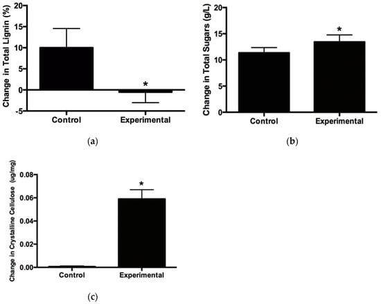 Changes in the lignocellulosic composition of vetiver biomass grown in control (control) soil and stamp sand (experimental) soil over 60 days: (a) percent changes in total lignin, (b) changes in total hemicellulose (sugar) levels in g/L, and (c) changes in crystalline cellulose in μg/mg. Error bars show standard deviation (n = 6). (*) indicates p-value = <0.05, using t-test with Welch’s correction and α = 0.05.