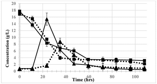 Total sugars (ν) consumed and ethanol (Δ) produced during fermentation of the vetiver hydrolysates. Solid lines represent the experimental group and dashed lines represent the control group. Error bars show standard deviation with n = 6.