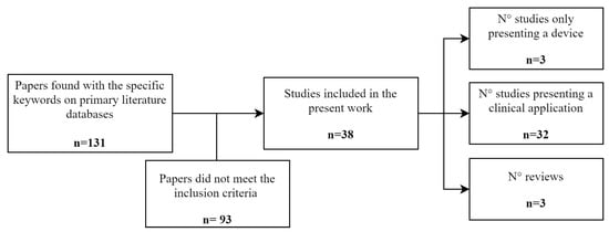 Based on the keywords, no systematic reviews in secondary literature sources were found, while 131 articles were returned from the primary literature databases. Carefully applying the inclusion criteria we selected 38 papers. Among these papers we identified three reviews, three studies only presenting robotics devices and 32 studies on clinical applications (Figure 1 shows the flow diagram that summarizes the process and results of the primary literature search).