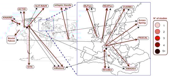 A world map identifying where robots for upper limb rehabilitation have been developed (red arrows) and where they have been used for children with neurological disorders (black dotted arrows). The color filling the circular areas indicates the number of clinical studies performed in the specific locations. The robot selected are: KINARM [46]; ACT3D [47]; NJIT-RAVR [48]; reHaptic Handle [49]; MyPam [50]; REAPlan [15]; ChARMin [51]; Armeo Spring [44]; PASCAL [52]; AMADEO [53]; WristBot [54]; InMotion2 [45]; IOTA [55]; Novint Falcon [56].