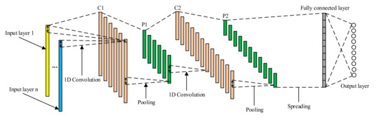 - The training set A was entered into the CNN model in batches for adaptive extraction of signal characteristics. The error between the predicted and actual values after the forward propagation was calculated. The error was then propagated in reverse direction by the BP algorithm in order to update the network parameters A and B layer by layer until the end of the iteration.