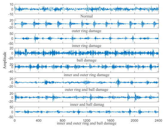 - The original signal and the noisy signal that was obtained by mixing the original signal with Gaussian white noise, were processed by the fast Fourier transformation (FFT) and envelope spectrum analysis (ESA) to form the dataset A and dataset B, respectively. 87.5% of a sample in a randomly selected dataset consists of a training set, and the remaining samples are composed of a test set.