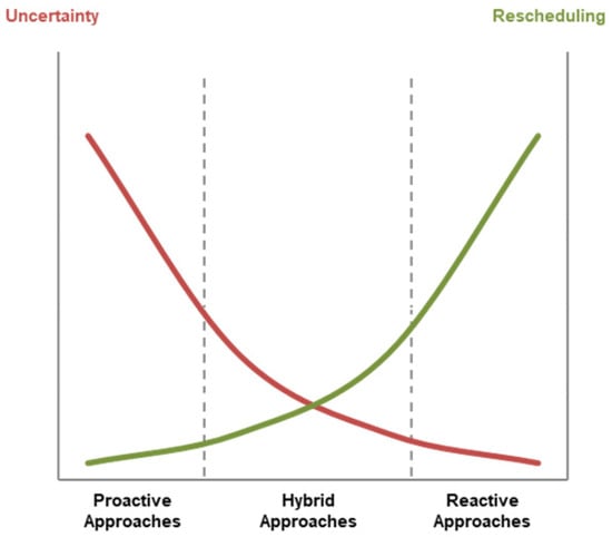 In some situations, the difference between reactive and proactive methods is not so clear. Some authors consider hybrid approaches that combine simplified proactive methods to define the preventive schedule and afterwards define a reactive approach to deal with uncertainties not covered by the proactive initial stage [6,9]. However, there are still few works that could be included within this category, due to the novelty of the proactive scheduling solutions [9]. Figure 1 represents the behavior of the different approaches in terms of uncertainty analysis and rescheduling capabilities.