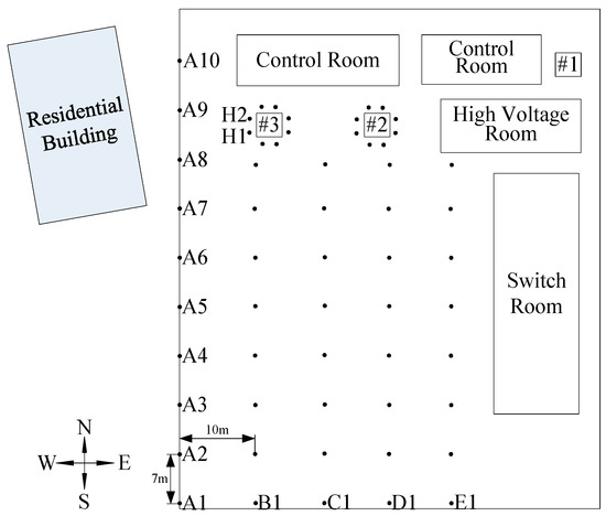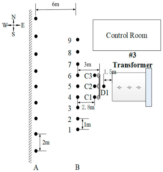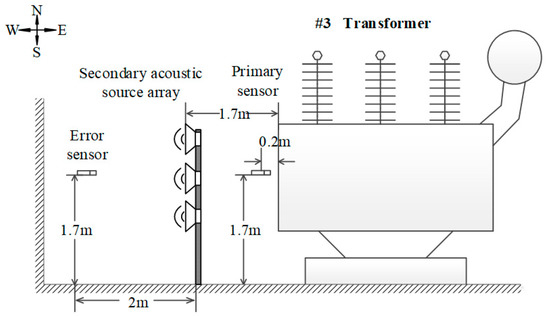 A 220 kV substation with a high level of transformer noise located in residential area is taken as the research object. Such industrial noise is a typical acoustic pollution source and needs to be governed. Transformer noise is collected and measured, and then the acoustic characteristics, frequency characteristics and noise distributions are analyzed. The analysis result is used to guide the ANC system control algorithm and the secondary acoustic source placement. The schematic diagram of the substation structure and probe location is shown in Figure 1.