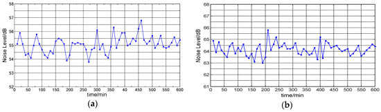 A total of 10 time points are recorded at intervals of 5 minutes, and the average of the results of each test point at 10 time points is shown in Table 3. The sound map of this area is drawn from the measured data and the noise attenuation model represented by Equation (1), as shown in Figure 13. At the same time, at 100 Hz–500 Hz, these 5 noise components of the noise reduction effect observation, take A1 to A10 and B1 to B10 10 times the average measurement.