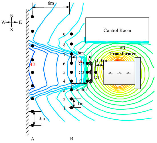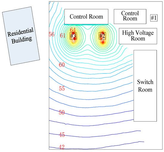 where r is the distance from predicted point to sound source. r0 is the distance from reference point to sound source. α is the atmospheric absorption attenuation coefficient of the frequency band noise. is the ground factor of the sound source area. is the ground factor of the receiving area. is the ground factor of the intermediate area. N1, N2, N3 is the Fresnel number corresponding to the three diffraction paths along the rectangular obstacle. Using the measured point data and the noise attenuation model, substation sound field distribution is shown in Figure 4.