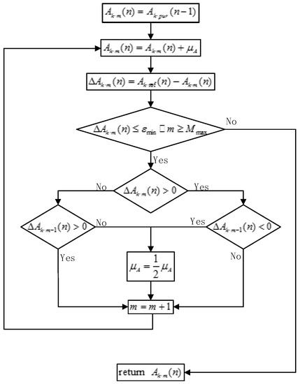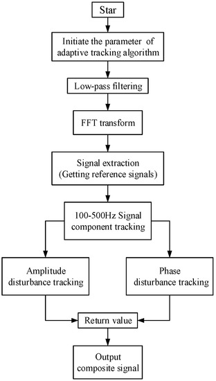 In this work, we focused on the conclusion of transformer noise characteristics analysis, and proposed an adaptive tracking algorithm for 100 Hz to 500 Hz noise components. The five noise components belong to low frequency noise. Comparing with high-frequency noise, it is easier to achieve compensation and tracking of amplitude and phase. The adaptive tracking algorithm proposed in this paper draws on the perturbations observation method in photovoltaic power generation, which tracks the maximum power point under the dynamic change of external factors (temperature, sunshine). The algorithm is a self-optimization algorithm [20]. Its basic principle is judging the change direction of output power after adding voltage perturbations, and then adjusting the perturbations voltage to make the output power towards the maximum point. In the Equation (1), the time-varying parameters of the periodic noise of transformer noise are amplitude and phase , which can be approximately considered as a continuous variation. This paper proposed an adaptive tracking algorithm by adding perturbations of amplitude and phase. Its basic principle is judging the change direction of residual noise after adding perturbations and then adjusting the perturbations to make the residual noise towards the minimum point. When the residual noise reaches the optimum value or constraint conditions, the current amplitude and phase are output. The algorithm flow is shown in Figure 5.