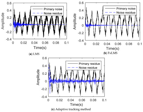 There is an inconsistency and contradiction between the step size and the convergence speed in the LMS algorithm [3]. Its convergence speed is the slowest of the three algorithms in the simulation experiment. Since perform secondary channel parameter estimation is needed in the FxLMS algorithm, when the algorithm is applied to open sound field, the influence of the secondary channel parameter estimation and acoustic feedback phenomenon may lead to the performance degradation, or even instability of the algorithm [21]. In addition, the algorithmic stability of the LMS algorithm and the FxLMS algorithm is closely related to the power spectrum of the input signal [21,22]. When there is pulse signal in the input signal, the LMS algorithm and the FxLMS algorithm are unstable. However, because the algorithm proposed in this paper sets the error limit and the maximum number of adjustments, even if the pulse noise causes the current calculation to not converge, it will not cause the algorithm to be unstable.