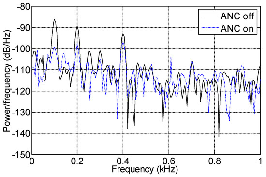 Figure 14 shows that, the ANC system prototype proposed in this paper for the five noise components were effective. It has the biggest noise reduction effect on 100 Hz and with the increase of frequency, the noise reduction effect is gradually reduced. And there is no obvious noise reduction effect on the 500 Hz noise component. Possible reasons for this phenomenon are: first, the higher the frequency is, the shorter the acoustic wavelength is, and it makes the space radiation more complex. Second, in the control algorithm, it is difficult to achieve high-precision phase compensation in a high frequency control algorithm. Moreover, it has higher requirements for the performance of the algorithm.