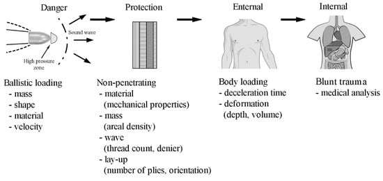 The modern approach to promoting the survival of soldiers on the battlefield involves a series of processes related to the design of appropriate personal protective ballistic shields. This must be assessed comprehensively for all scenarios where, on the one hand, a soldier’s body is affected by impact energy and, on the other hand, the energy is absorbed in such a way that it gets distracted by a suitable absorber (a helmet or bulletproof vest, etc.), designed to protect human body surface from exposure to serious blunt injuries caused by the inertia forces of ballistic shields influencing a human body. In this case, firstly, the procedure shown in Figure 1 must be followed when setting out to design an effective ballistic shield.