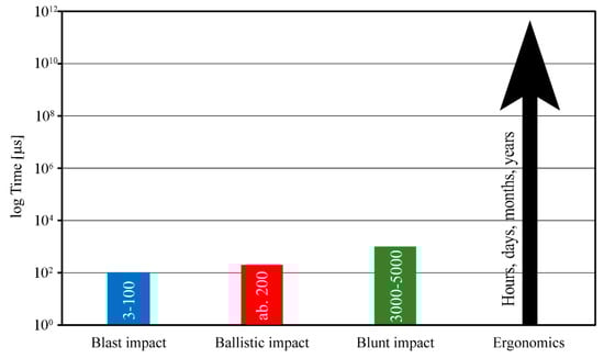 These categories vary depending on the duration of the impulse of force during which an injury is sustained, and the distance from the epicenter of an event. As pointed out [,,,,,], traumas arising from blast impact are experienced within 3 to 100 microseconds of an event and, with a ballistic impact, within about 200 microseconds. In this case, high temperature is also an additional element of trauma. Blunt impact is a consequence of the two abovementioned categories, and the time in which it appears is determined by many factors, such as the velocity of wave propagation in a medium (place), etc. If injuries are associated with the use of arms or soldier operations in conditions involving difficult terrain (defined as ergonomic), the time they take to affect the human body is currently counted in units per day or per year. However, it should be emphasized that blunt trauma resulting from blast or ballistic impacts can also be revealed after a certain time since processes occurring in the brain are very difficult to diagnose (see Figure 2).