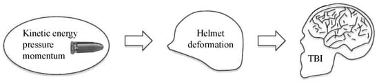 As the head is the most important human organ, it needs particular protection. For this purpose, helmets [,] are used with the aim of reducing the effects of so-called traumatic brain injury (TBI) as a result of projectile impact (see Figure 4).