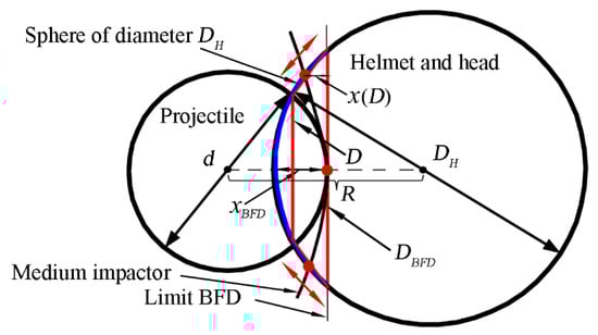 Estimating the BC for a head constitutes a complex problem. Determining the scope of a helmet’s BFD (the value specified in the National Institute of Justice (NIJ) Standard for Ballistic Helmets) as the contact geometry (the curvature of contact between a helmet and a projectile) poses considerable problems associated with determining the actual diameter of the surface [] (see Figure 6).